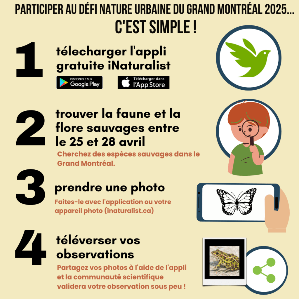 - Toutes vos observations iNaturalist compteront automatiquement pour le projet Grand Montréal