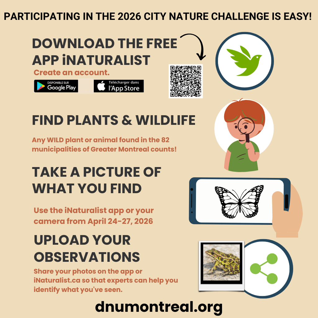 The next edition of the challenge will take place from April 24-27, 2026. To participate, simply take photos of wildlife or wild plants during the four days with the free, non-commercial iNaturalist application or upload your photos directly to the website iNaturalist Canada. Your observations will be used for international biodiversity and urban ecology research and can make a difference for urban conservation!